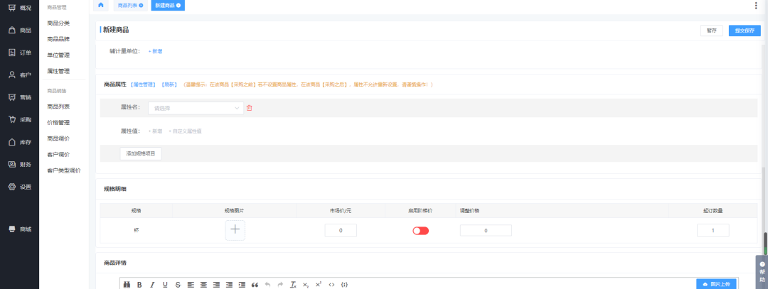 创建企业选择了单店铺后,我们发布商品时可直接将商品在商品列表进行新增发布到各个店铺中,去除了在商品资料页面填写商品信息,又到商品列表进行发布,因为是单店铺,所以发布商品时无需选择商铺,在商品列表发布商品选择好商品规格单位后直接给商铺规格设置价格就可以发布上架了。