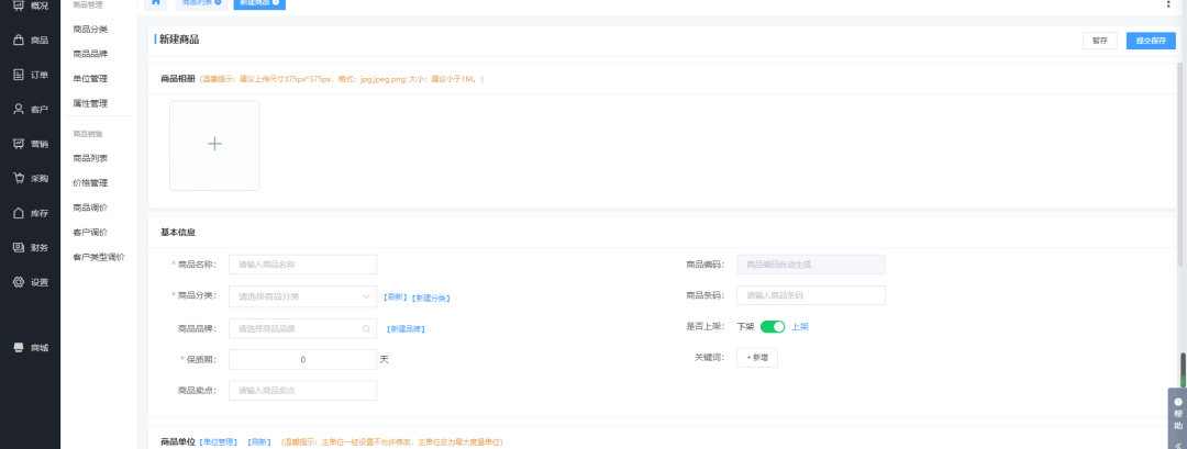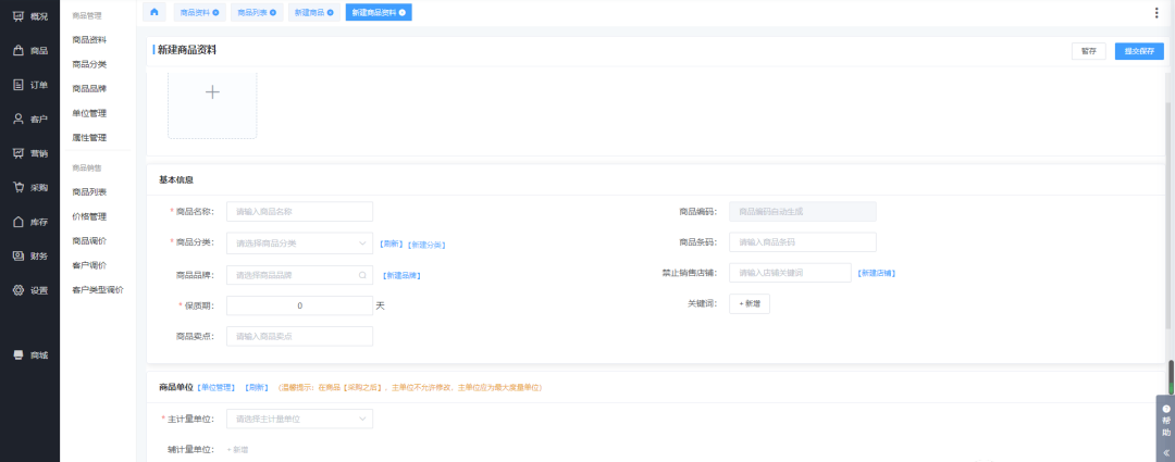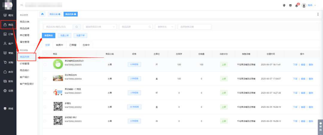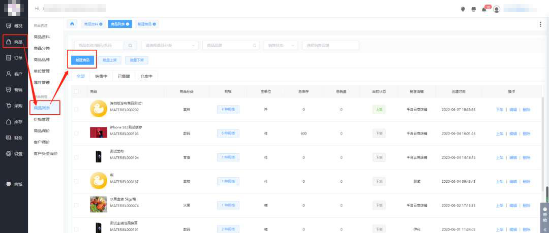 创建企业选择了多店铺后,我们发布商品时就需要先把商品录入到商品库中,也就是我们后台中的商品资料,在添加完商品资料后,将商品在商品列表下进行发布到各个店铺中。