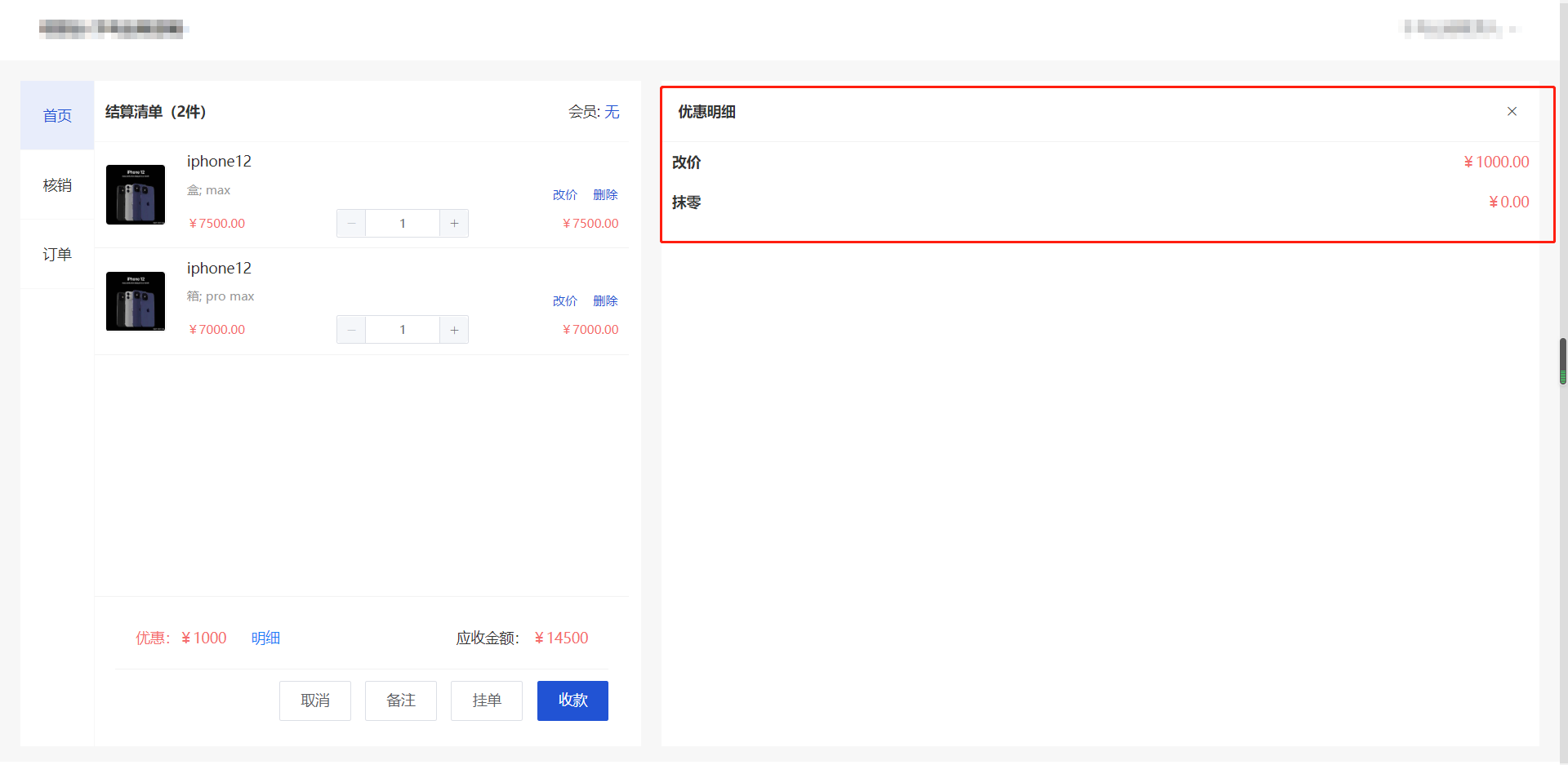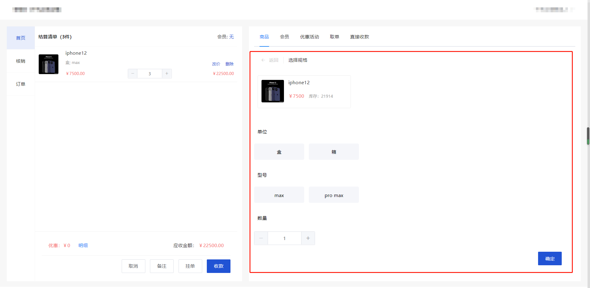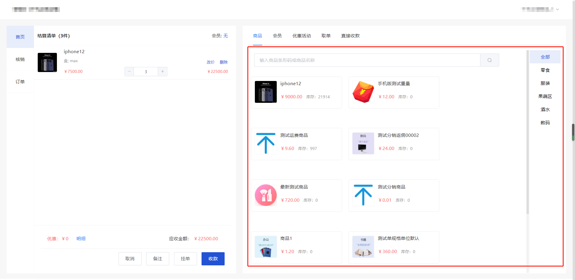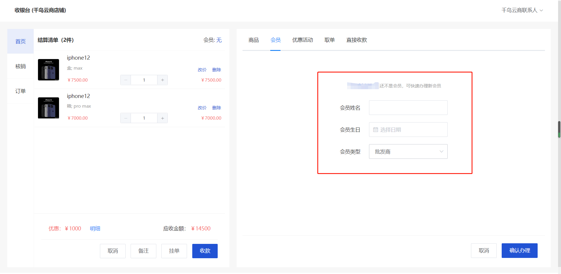 安菲云商-PC端收银台,收银台打通线上线下,支持营销活动,改价,新增会员,收款等操作。