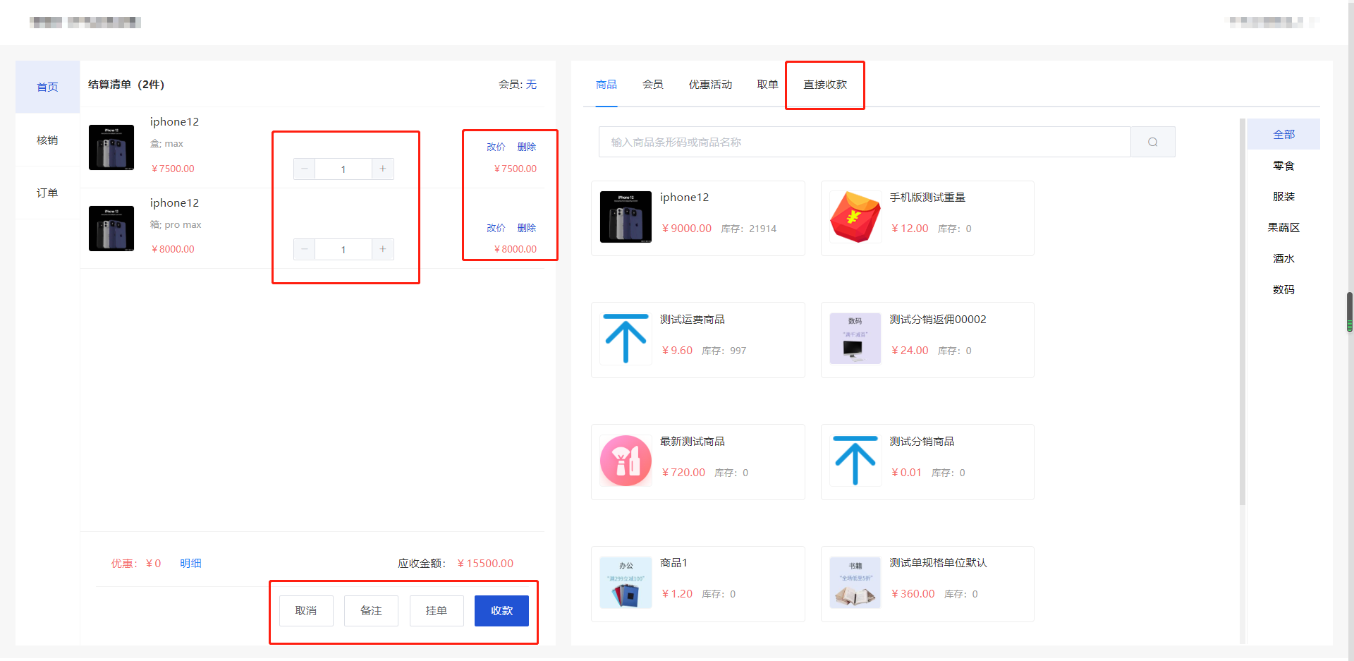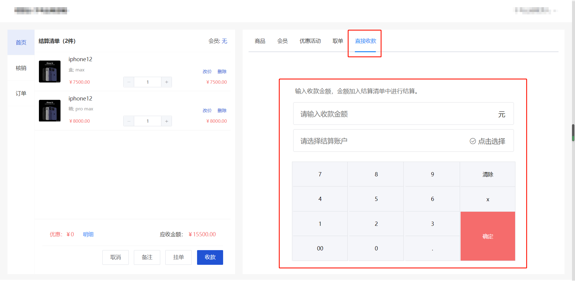 点击直接收款,输入收款金额,结算清单中会生成一个直接收款的临时商品。直接收款商品不参与营销活动。