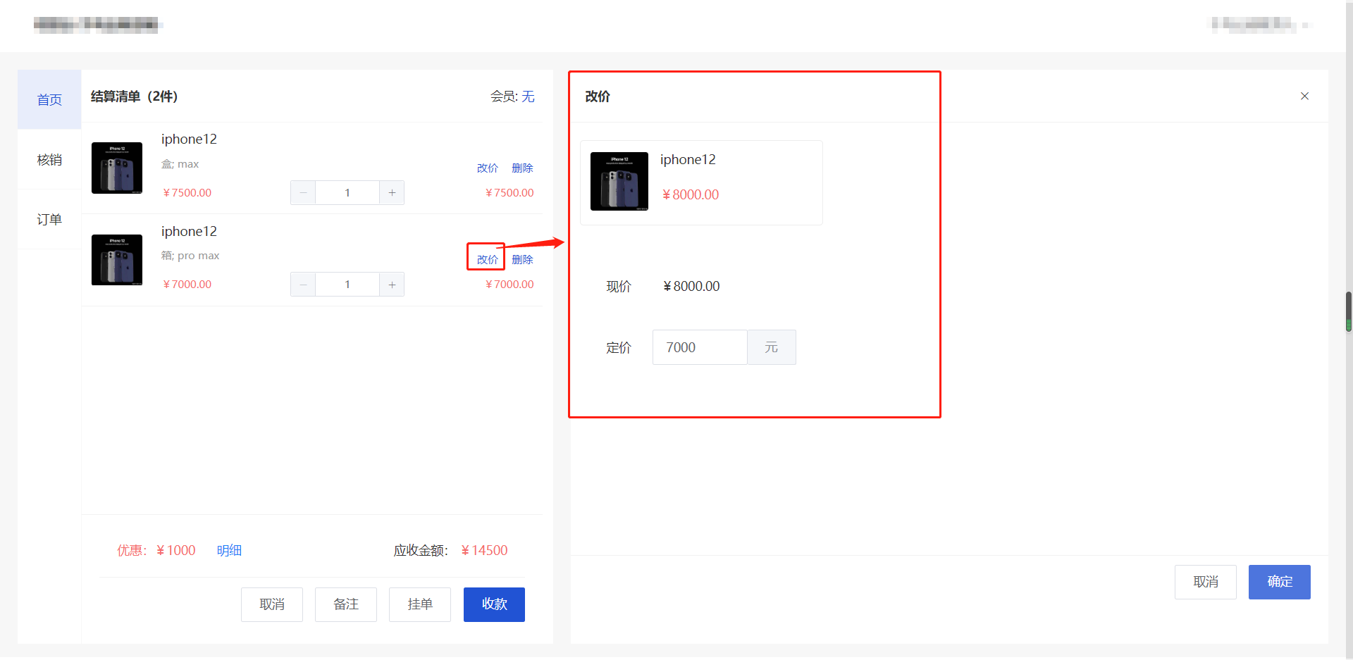 点击可以修改商品价格,修改成功后,结算清单中商品价格显示为改价后的价格。