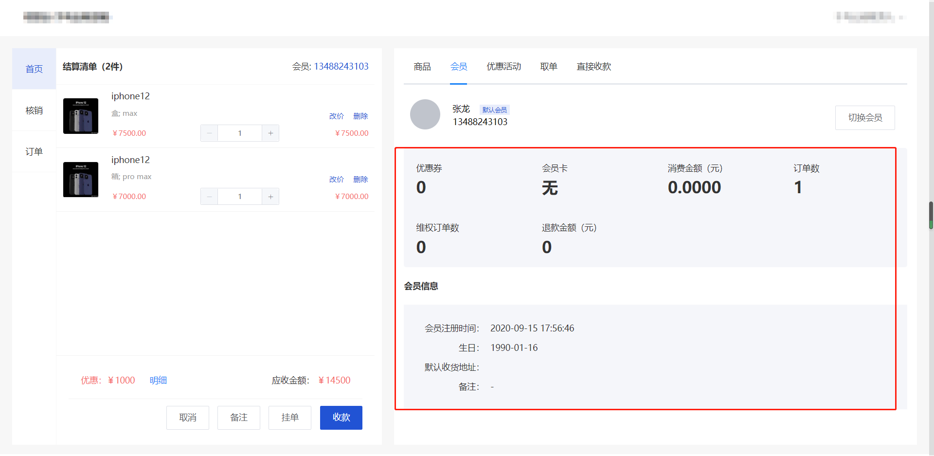 若手机号还不是商城会员时,可快速为其办理新会员。
