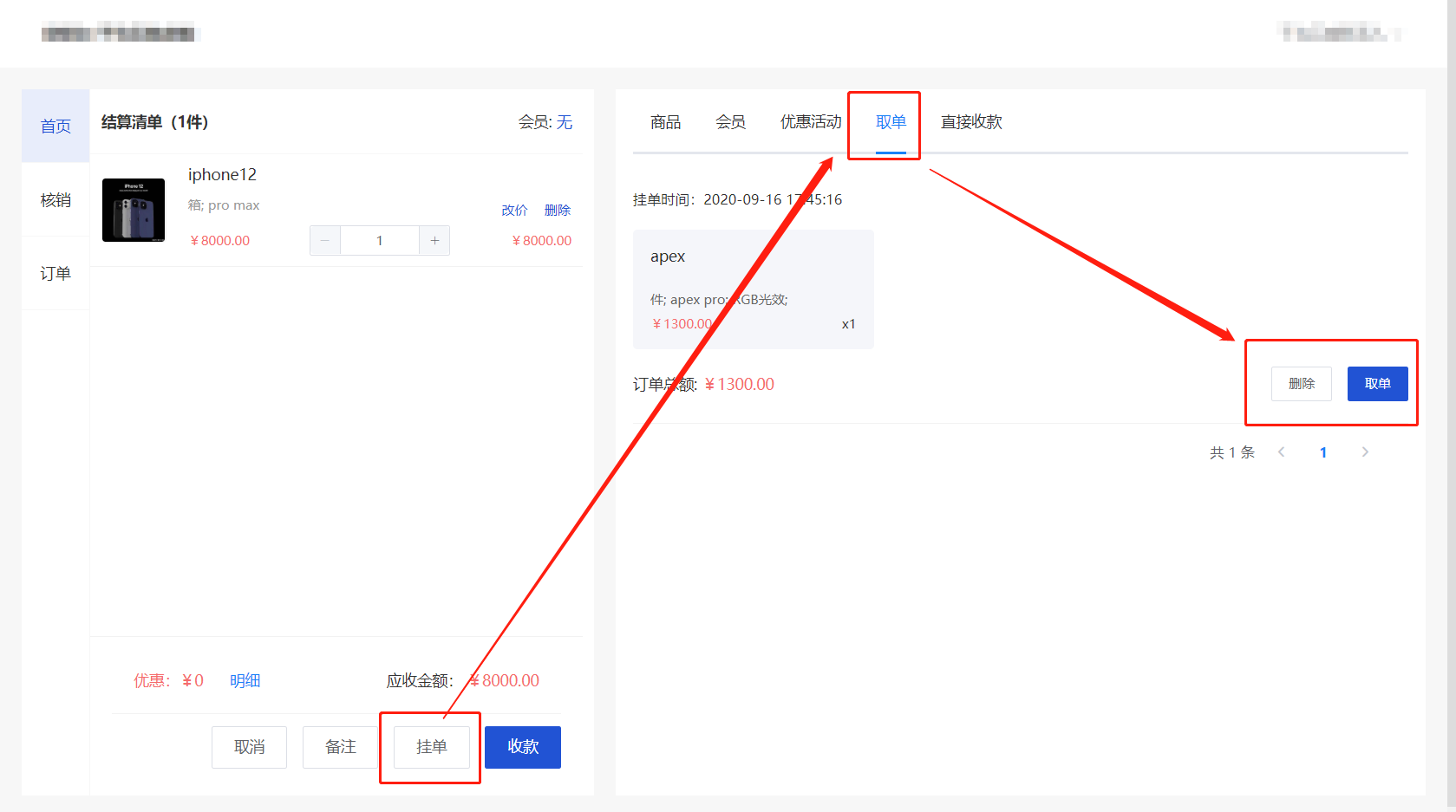 取单界面展示正在挂单的结算订单,点击取单后继续进行结算。取单时若有正在结算的商品,则该商品自动挂单。