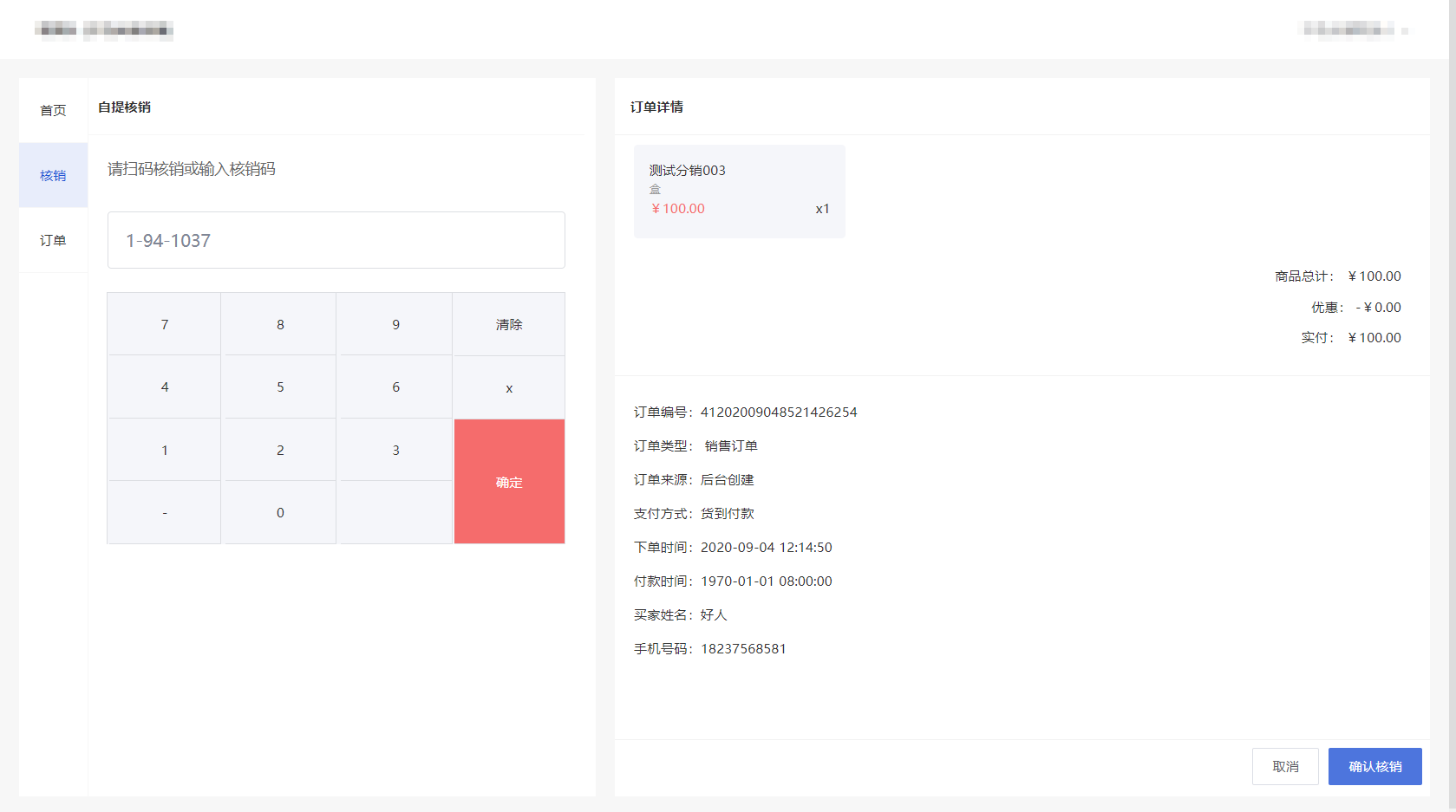 核销可以核销自提订单,用扫码枪扫描二维码或输入自提码点击确定,右侧会显示该自提订单的订单详情,点击确认核销,即可核销成功。