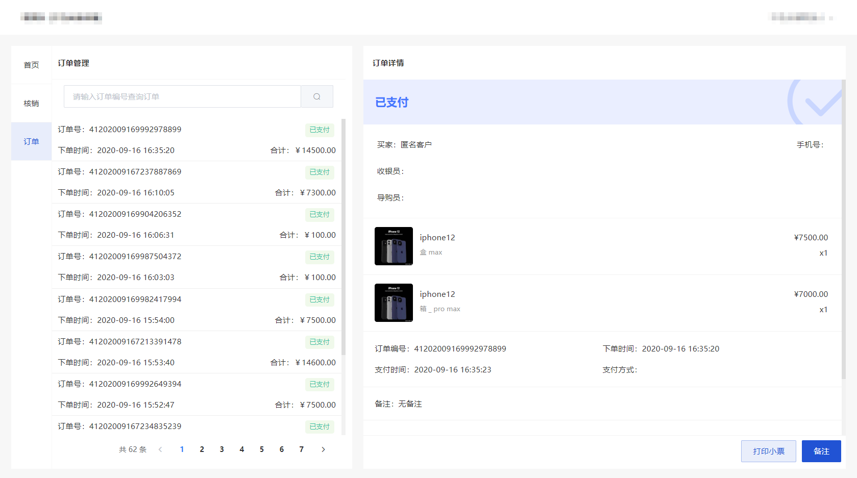 订单显示收银台所有订单,可以进行备注、打印小票等操作。