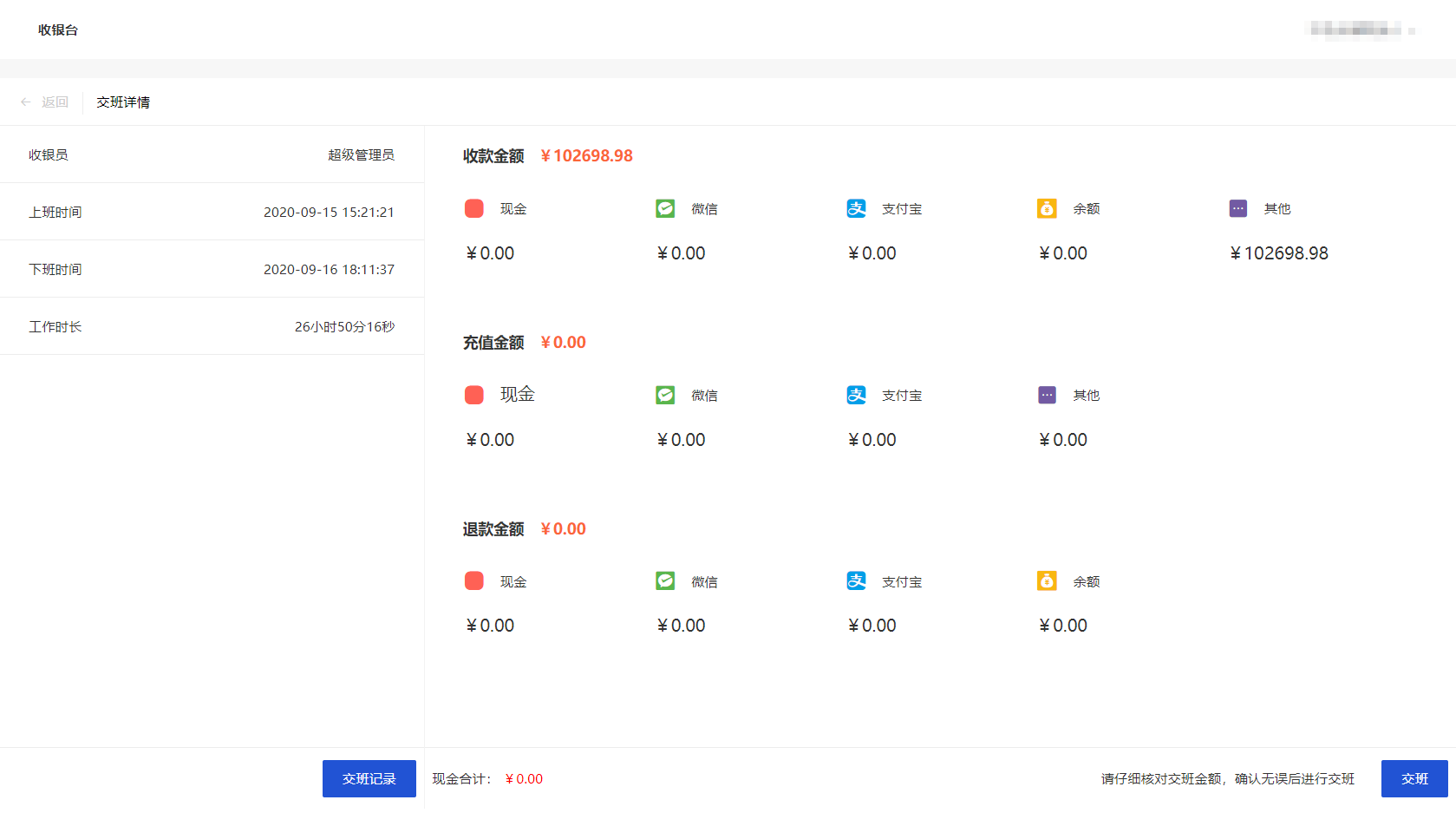 确认交班时间,中途关闭收银台或退出登录均不算下班。