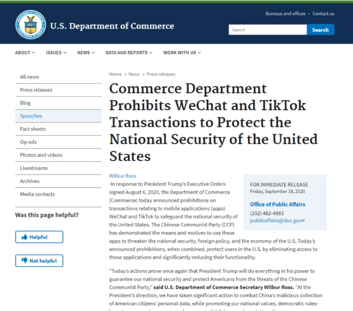 美国商务部称,禁止美国民众下载TikTok和微信的行为,是通过消除对这些应用的接触并显著降低其功能来保护美国用户。