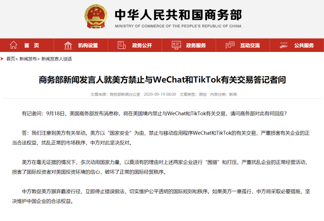 近日,美国商务部宣布,将从9月20日起执行微信和TikTok的禁令