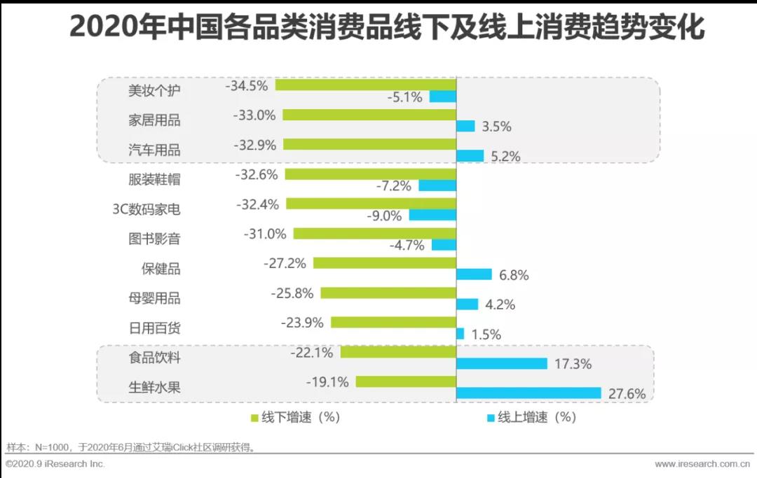疫情之下,2020年一季度中国GDP同比下降6.8%,首当其冲的是零售、餐饮和生活服务行业,疫情期间注吊销企业数量相比上年同期几近翻倍。美妆个护、家居用品、汽车用品等品类的线下消费萎缩超过30%,生鲜水果、食品饮料的线上消费增速则高达27.6%和17.3%。